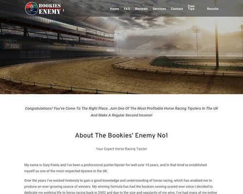 Description: A long-running, high performing Horse Racing tipster service featuring two top quality racing tipsters covering both national hunt racing and flat racing. We are very easy to promote and have an industry leading 50% commission on sales.
