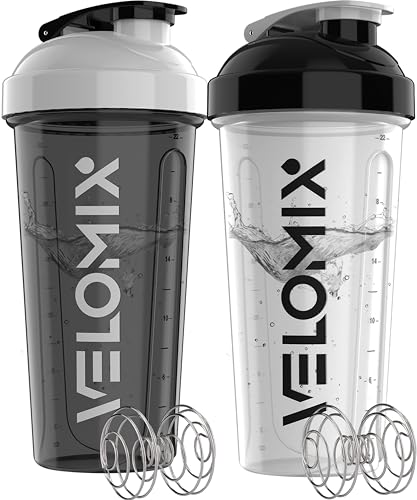 VELOMIX -2 Pack- 28 oz Protein Shaker Bottles for Protein Mixes – 2x Wire Whisk | Leak Proof Shaker Cups for Protein Shakes | Protein Shaker Bottle Pack (Black/White)