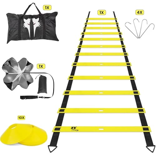 Our soccer training equipment for kids 8-12 Includes 1 Speed Ladder, 12 Agility Cones, 4 Steel Pegs, 1 Speed Parachute, 1 Parachute Bag, 1 Carry bag, and User Manual