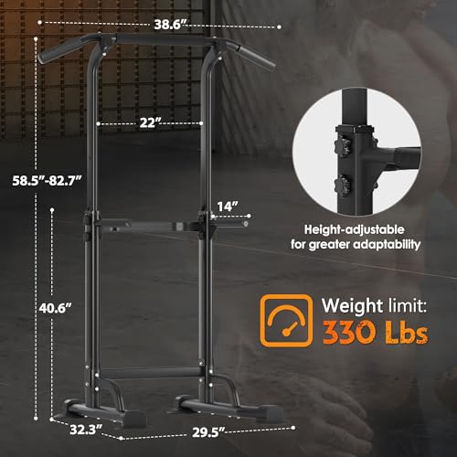 💪Sturdy Construction:This Power tower is made of high quality steel construction with high-density foam rubber handles and handrails and holds up to 330LBS, The long H-shape base provides more loading points. Adjustable heights from 58.5 inches to 82.7 inches, suitable for 99.99% of users.