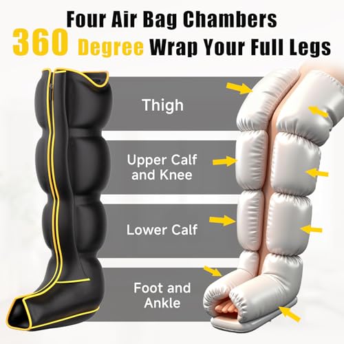 Air Compression Massage System: This leg massager delivers professional-grade muscle relaxation. 4 independent airbags gently inflate and deflate in a rhythmic wave motion, targeting the feet, calves, knees, and thighs respectively, mimicking professional massage techniques to promote blood circulation, accelerate metabolism, and relieve muscle stiffness after exercise.