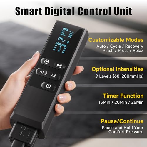 Multifunctional and Personalized Design: This leg compression massager for circulation features 9 adjustable intensity levels (60-200 mmHg), 6 different massage modes, and 3 timer settings (15/20/25 minutes), allowing you to customize your massage experience to your individual needs. The intuitive handheld digital controller gives you complete control over your relaxation and recovery journey.