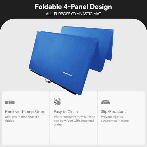 Bring comfort, safety, and versatility to every workout or practice session with the BalanceFrom Folding Gymnastics Mat. Measuring 10 feet long by 4 feet wide by 2 inches thick (120 x 48 inches), this extra-large training surface is made for tumbling, yoga, Pilates, light aerobics, martial arts, stretching, and more. The thicker 2-inch depth is filled with firm padding that cushions and supports joints, helping to safeguard your knees, back, elbows, and spine during high-impact movements. Designed for security, the double-sided, non-slip vinyl surface keeps the padded mat firmly in place and resists moisture, making cleaning it quick and easy. Reinforced stitching adds durability and enhanced strength during daily use. With hook-and-loop strips on all four sides, you can securely connect multiple BalanceFrom 10’x4’x2” mats together, creating a larger workout or tumbling area customized to your floor space. When training is over, the 4-panel foldable design reduces this exercise equipment accessory down to 4 feet long by 4 feet wide by 8 inches thick (48 x 48 inches). Built-in carrying handles make transport simple, whether moving it around indoors, taking it to the garage, or bringing it to the gym or studio. Lightweight at only 15 pounds, its compact size is easy to move, store, and take on the go. Whether you’re building a home gym, outfitting a studio, or providing safer flooring for activity and play, the BalanceFrom 10ft x 4ft x 2in All-Purpose Folding Gymnastic Mat offers the functional blend of comfort, portability, and durability for adults and users of all ages.