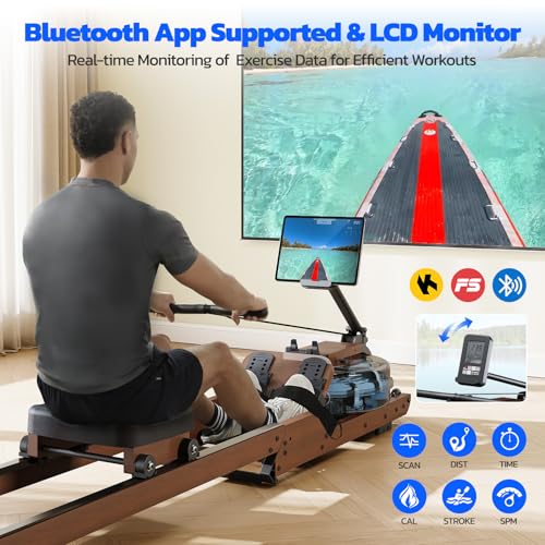 Dedicated LCD Monitor & App Compatible: Track your progress in real-time with the clear LCD display, monitoring key metrics like time, distance, strokes, and calories burned. Besides, you can connect your smartphone or device to the water rowing machine via Bluetooth, track your exercise metrics during your row, and immerse yourself in a variety of live training videos to complete passionate exercise challenges
