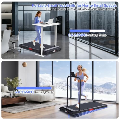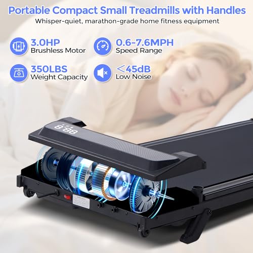 【High-Performance Small Treadmill with Incline】Powered by a 3.0HP motor, this treadmill home small reaches 0.6–7.6MPH and supports treadmill 350 lb capacity. This portable treadmill with handles offers incline training plus under desk treadmill and walking pad treadmill with handle bar versatility.