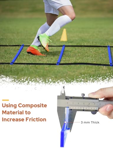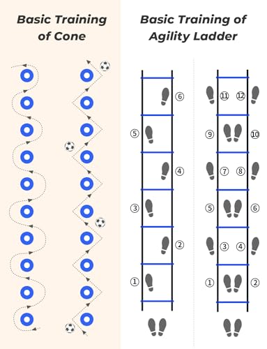 20 Feet 12 Rungs Agility Ladder and 12 Cones for Workout: Ideal for beginners and professional athletes, this agility ladder set is a must-have for improving speed, agility, coordination, quickness and overall athletic performance.Easy Adjustable 12 Rungs Not Tangled for the next time use. 4 Agility Hurdles Football Soccer Speed Training Equipment Set: Agility Hurdles with Ajustable 2 Height for different drills and techniques.A must have for football baseball basketball workout acceleration training. Resistance Parachute with Belt and Bands Speed Training Set: Parachute with fast release waist belt include for improved speed, stamina, strength, and acceleration chute releases while running for over speed training. Football Training Equipment Set Suitable for People of all Ages: Portable Durable Workout Training Sets for kids, athletes, children, adults, coaches, sports and fitness enthusiasts. All You Need Agility Training Equipment Kit Include: Ajusable Height 4 Agility Hurdles, 20ft 12 Rungs Speed Ladder,12 Disc Cones,1 Resistance Parachute with release belt, 1 jump rope, 5 resistance bands,1 cone holder,1 paper drills guide,4 metal pegs,1 carry bag.