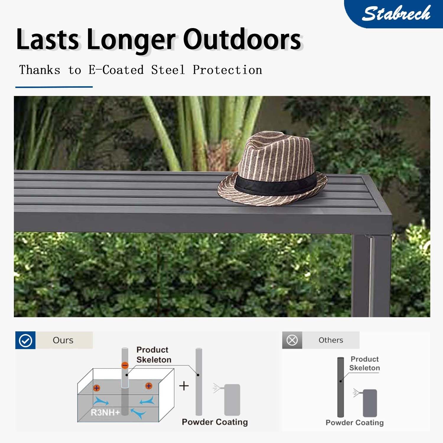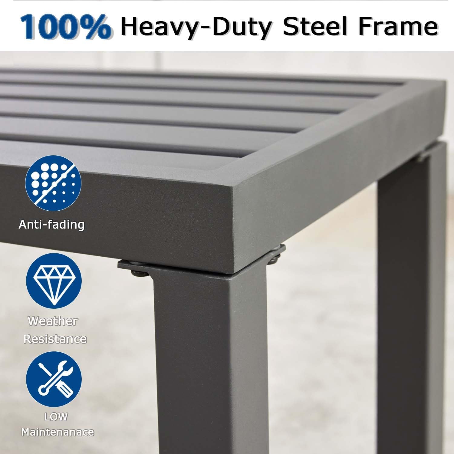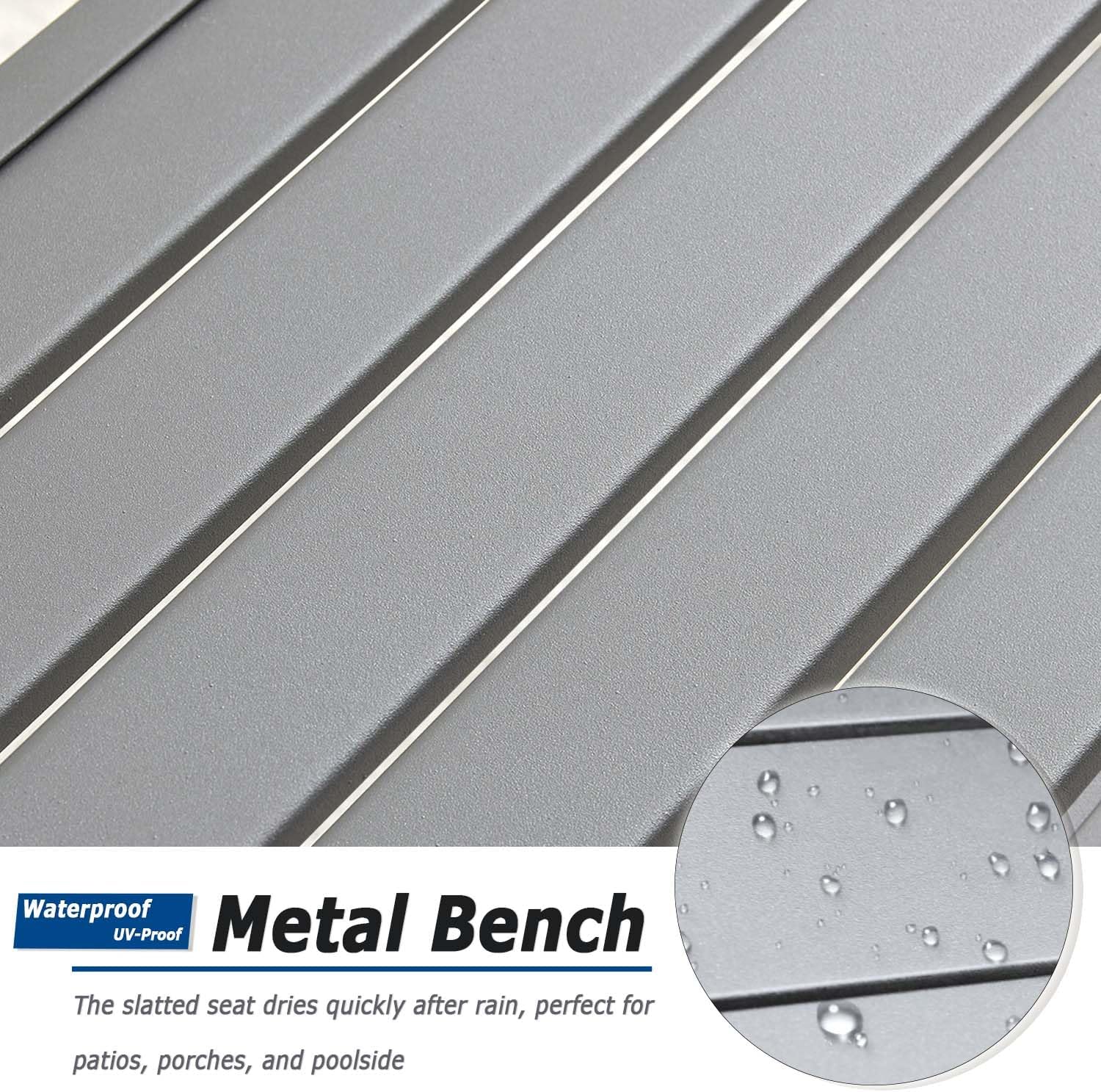 【All-Weather Resistant】 Crafted from high-quality metal with a weatherproof finish, this outdoor bench resists rain, sun, and rust, ensuring long-lasting use without fading, peeling, or cracking. Unlike wood benches that are easy to break and costly to maintain, this bench stays strong season after season