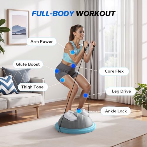 3-in-1 PREMIUM BALANCE TRAINING EXPERIENCE VERSATILE WORKOUTS IN SECONDS: Balance ball trainer between stability ball for core exercises, anti-slip balance board for push-ups/planks, and dual resistance bands for arm toning. 37% more functional than single-mode trainers, enabling full-body HIIT, yoga & physical therapy, postpartum fitness