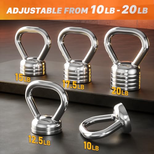 MULTIPE WEIGHT OPTIONS: This kettlebell features an innovative mechanism that allows you to easily adjust the weight according to your fitness goals. Simply rotate the dial to set the desired weight between 10lb/12.5lb/15lb/17.5lb/20lb. With this kettlebell, you can choose from a variety of weights all in one.