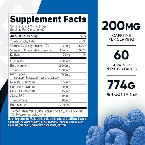 Potent Energy Boost: Each serving packs a punch with 200 mg of caffeine, providing a surge of energy to fuel your workouts and keep you at the top of your game. Say goodbye to fatigue and hello to sustained vitality.