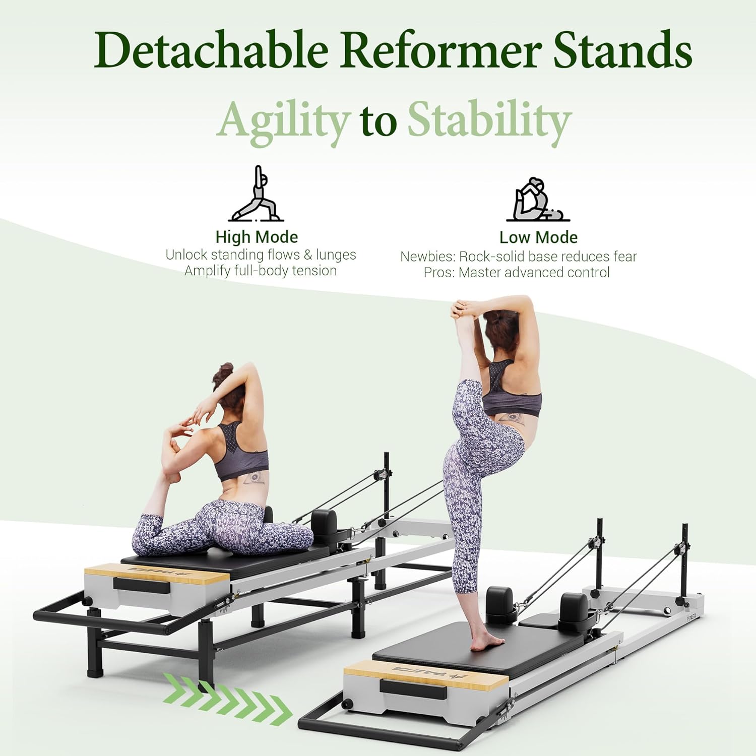 Adjustable Reformer Heights: Our pilates reformer machine features easily removable stands for quick height adjustments. The lower reformer height provides greater stability, eliminating the fear of falling, making it an ideal choice for beginners and those tackling complex movements. While the higher height provides easy access and challenge for most practitioners.