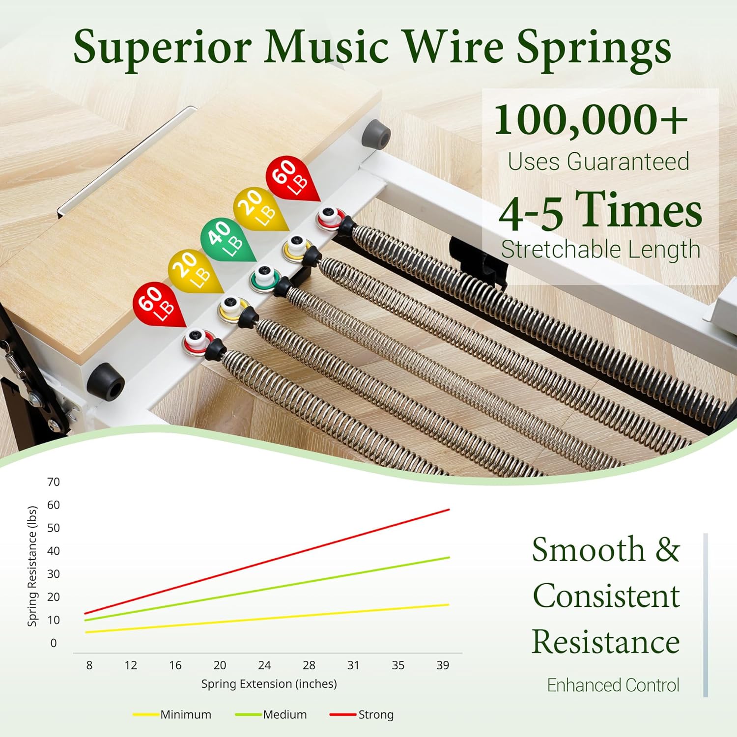 Ultimate Stability and Comfort:Our details produce your results. The pilates reformer machine supports up to 500 lbs with six sturdy legs for enhanced stability. Enjoy premium piano wire springs for smooth, silent operation, designed for over 50,000 uses. The high-density foam padding ensures lasting comfort and support, while ultra-smooth tracks and quiet PU wheels provide effortless gliding. Elevate your pilates practice with our top-of-the-line reformer!