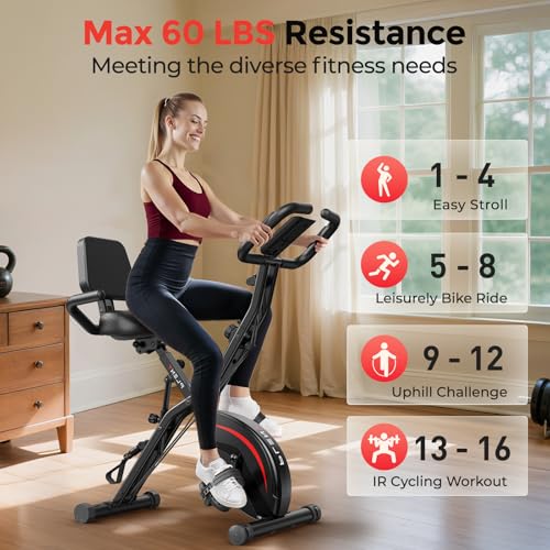 5 IN 1 DESIGN: Foldable exercise bike combines multiple exercise modes in one, supporting high intensity fat burning, low intensity stretching and strength training. Equipped with resistance bands for rowing and stretching. You can easily realize all-round workout goals at home.