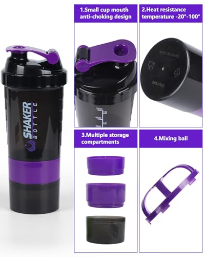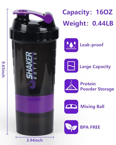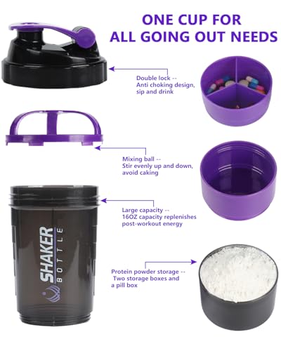 Protein Shaker Bottle,16 oz Shake Cup for protein powder with Storage,Sports Water Bottle,Non Slip 3 Layer Twist Off 3oz Cups with Pill Tray Leak Proof Shake Bottles for Protein Mixes