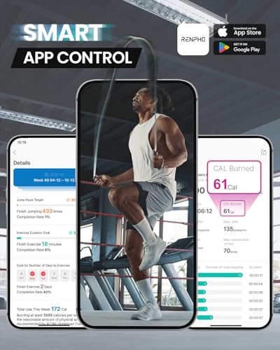 Reach fitness goal with APP Renpho Health: Our fitness skipping rope can connect with our APP Renpho Health that can easily analyze and track your periodic workout data. You can grasp your skip time, total skip number, calories burned, and tangles to reach your fitness goal at any time.