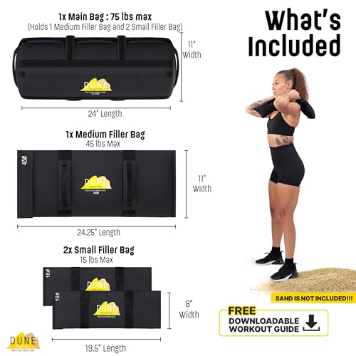 Redefine What It Means to Break a Sweat! Get ready to elevate your workout game and flow to your highest peak with our workout sand bags! They are crafted by multiple fitness experts, to provide you with a dynamic and versatile exercise experience. Ever wished your workout gear could do it all? Ours does! With a whopping nine handles on the main bag, this fitness sandbag is the solution you’ve been looking for. Bicep curls, rows, deadlifts, carries, lunges, throws – you name it, our sandbag can handle it. You can also use them for lighter workouts or tag in a workout partner for some serious fitness fun! Quality matters, especially when it comes to your workout gear. That’s why our sand bag for exercise is crafted from high-quality 1200D oxford material. Enhanced with reinforced stitching, sturdy YKK zippers, and secure Velcro closures, it ensure that no sand will escape during your most intense workouts. You deserve equipment that can keep up with your dedication – and this sandbag is up for the challenge. Our compact sandbags are your passport to fitness freedom. Whether you’re at home, in the park, or jet-setting on vacation, these bags are ready to roll. They’re lightweight when empty, so you can easily carry them and fill them with dry beach sand whenever you’re on a beach vacation. It’s time to redefine where and how you break a sweat! And unlike traditional weights, our sanbags won’t damage your floors or scratch your accessories. So, what are you waiting for? Unleash your strength, enjoy the freedom of a portable gym, and make every workout an adventure with our workout sand bag! About Us: Dune Athletics is a small, family-owned business. We love designing convenient and thoughtful products that you can use in your everyday life. Our sand bags workout equipment is an effort to do just that. We hope you love our garage gym equipment as much as we do. Thanks for supporting our family business!