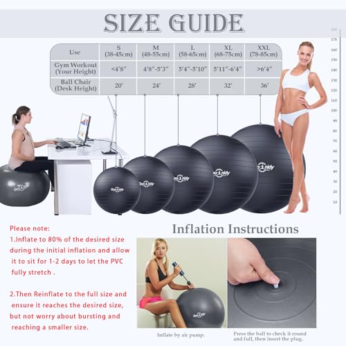 EASY TO USE – Come with quick inflation pump, 2 air stoppers, and a plug remover, easy to inflate and deflate. And easy to clean just with a soft damp cloth. Available in 5 sizes, 45cm 55cm 65cm 75cm 85cm to meet your special needs. ( Please keep the ball away from woodwork, wooden furniture or painted walls becuase wood or painting are unfriendly to the exercise ball.)