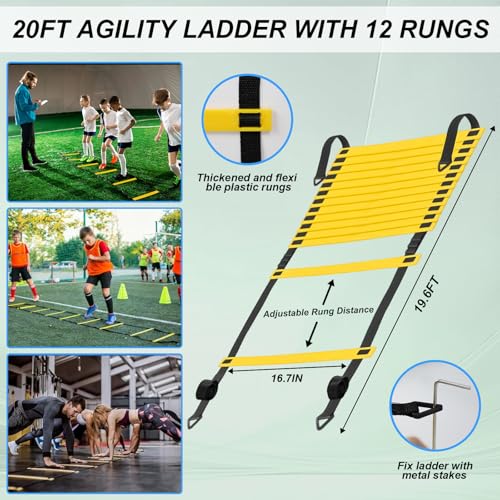 Speed Agility Training Equipment Set, Agility Ladder 20ft, 12 Football Cones, Resistance Parachute/Soccer Kick Trainer, Jump Rope, 5 Resistance Bands, Football Practice Equipment for Kids Adults
