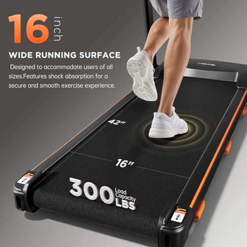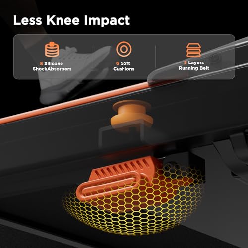 WIDE RUNNING BELT & SHOCK ABSORPTION SYSTEM: This home treadmill features an extra-large 42″ x 16″ running surface with 5-layer anti-slip textured material. Its advanced cushioning system combines 6 silicone pads + 6 built-in shock absorbers to provide maximum protection for joints and ankles. The exceptional shock absorption and stability support users up to 300 LBS, delivering the ultimate running experience
