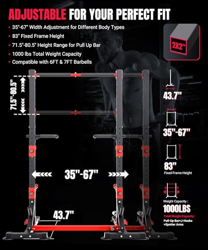 【Upgraded Safety Arms & J-Hooks for Secure Lifting】16.5” safety arms offer extra support for squats and bench presses, while 4” J-hooks ensure safe and easy barbell rack reracking, making solo training more secure