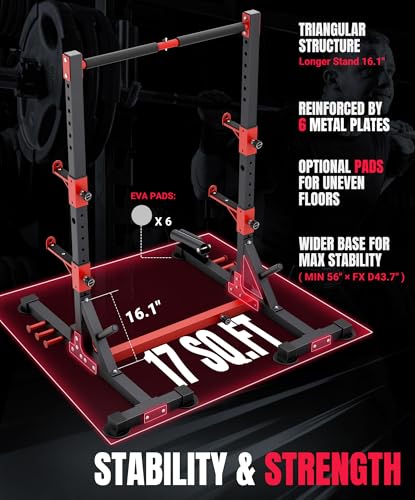 【Heavy-Duty Power Rack with Reinforced Stability】Built with a wide 54.7” x 43.7” base, 6 reinforced metal plates, and a triangular structure, this power rack provides maximum stability for intense workouts